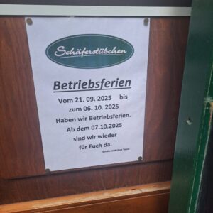 Aktuelles Betriebsferien Vom 21.09.2025 bis zum 06.10.2025 haben wir Betriebsferien. Ab dem 07.10.2025 sind wir wieder für euch da.Mit freundlichen GrüßenIhr Team vom Schäferstübchen